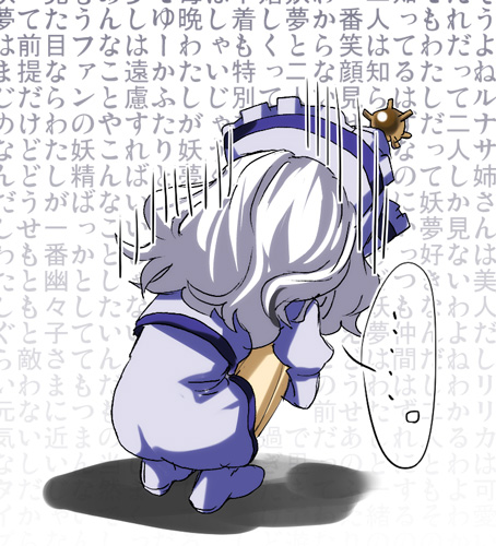 幽々子さまは普段の服以外にもたんと衣装を持ってますが、紫さま以外には見せない。とかいうマイルールを敷いてると思っております。