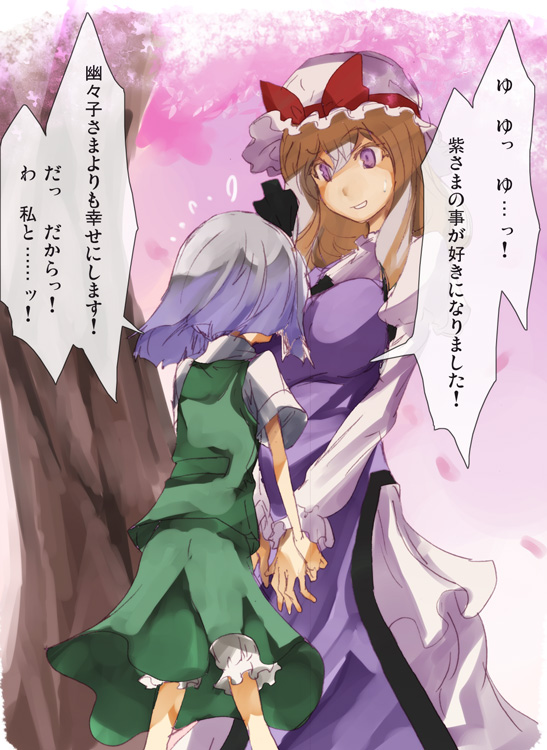 >ところで紫は妖夢のことは気に入っているから特別に幽々子のそばに置いていると思っています。(略)それにとらのあなの公式小説で「未熟だけどそれゆえ時々私には考え付かない発想をするから好き」みたいなこと言ってましたしね。 by 親月