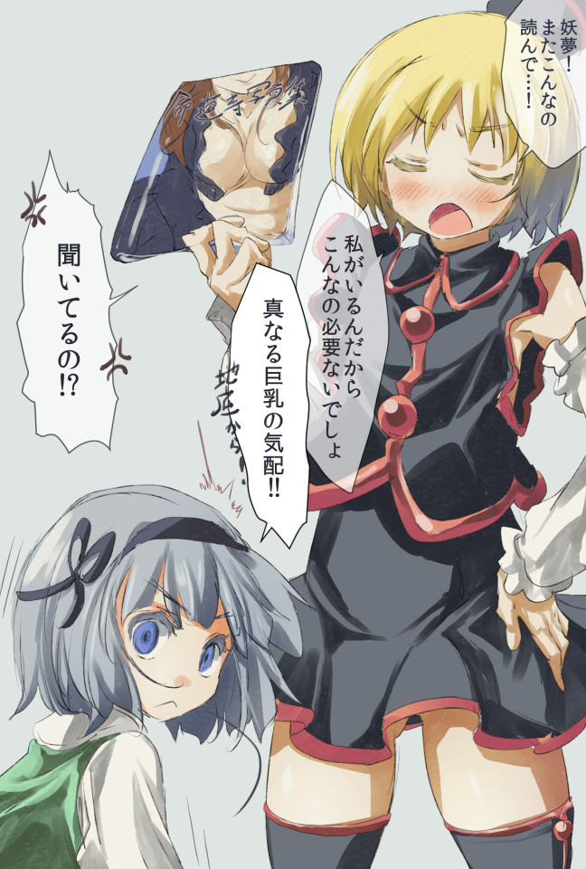 先代様がレオタード下着の理由はこうだと信じてます。 「硬すぎる」勇儀さんのや、「柔らかすぎて重力に屈した」マミゾウさんのとは別ベクトルの最強な最胸。である以上青においては 妖夢×先代 という新カプの提唱を・・・! と思いましたが、多分どうせまたルナサさんにボコられてお終いでしょうか。