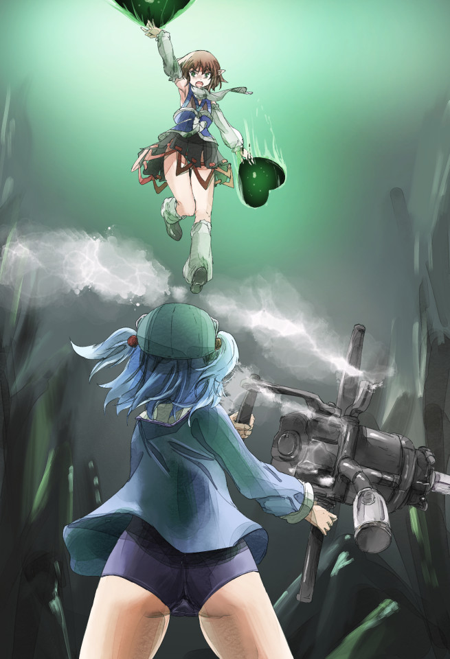 「勇儀みたいな筋骨隆々の体が一番可愛いのよ! そんな勇儀を毎日抱いてる私に嫉妬しろ! 羨め!!」「上辺しか見れない嫉妬狂い! 大事なのは中身、尻子玉だよ! そんなことも分からないなんて!!」 引き続きゆるーい修羅場です。ちなみに、にとりさんが持ってるのは削岩機ではなく、尻子玉蒐集用の削尻機ですので。ご安心ください。