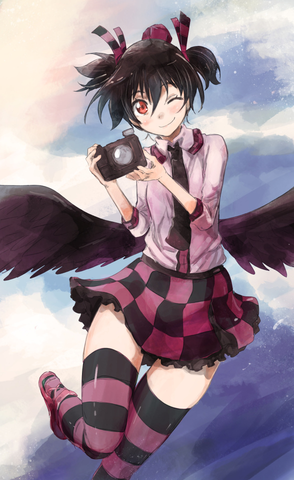 彼女服の文さん 友達の鴉天狗達が「はたてと一緒に恋人丼で食べたい」的な眼で見ていることを、文さんはまだ知らなかったり。「はたて様と合わせて嗅ぎたい」的な斜め上の獣欲で見ている白狼がいることも、まだ知らなかったり。