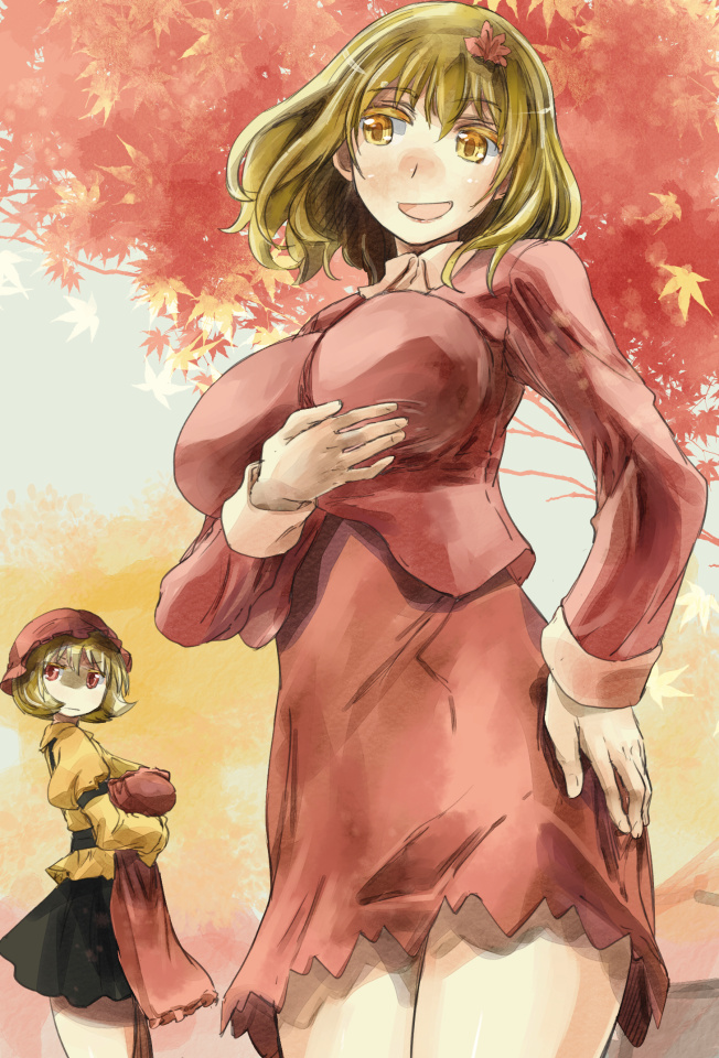 秋が近づくというだけで、なんにもしてないのに信仰が集まりまくって身長も胸も大きくなって女神さまみたいなオーラを醸し出すお姉さんが、妹さんは大っ嫌いだと。 なお、穣子さんは「豊穣の女神」というイメージで信仰されてるからか信仰が駄肉となって反映されるとかなんとか。