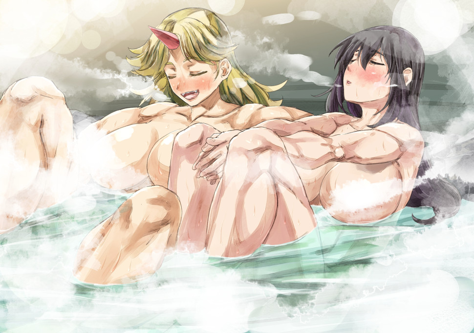 >筋トレしたなら汗をかくと思います(チラッ汗をかいたなら温泉に入ると思います(キリッ なお、お二人共超長身につき、肩までは浸かれない模様。地底はそこら中に温泉があり、湿度が超高いムワムワ空間だと。筋トレなんかしようものなら、雨に振られたようなビチョ姿になるものと思われます。