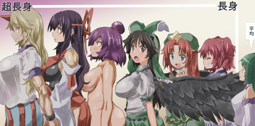 >身長差なら青版東方乳比べならぬ東方背比べも見て見たいものです。 超身長に含まれている神奈子様は何cmなのかしら。