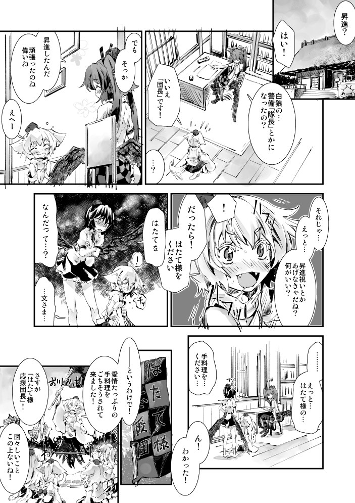 当然、文さんが居なかったら白狼天狗の獣欲が火を拭いて・・・・・・おや、爽やかな「昇進おめでとう」なお話のつもりでしたのに。これだから、椛さんは。これだから、まったく!