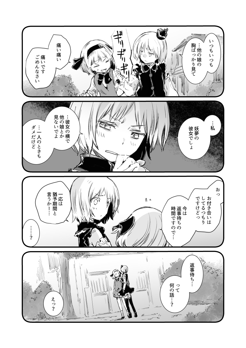 「正直者」 何気ない会話を一生背負うくらいの正直者が、妖夢さんです。待て と言われれば何百年でも待つ正直者が、妖夢さんです。愛情はさておいて、大きい胸には無条件に反応してしまうくらいにも正直者です。