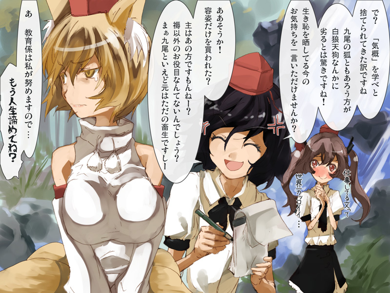 ある日突然やってきた九尾の新入り白狼天狗を、文さんが見逃すわけはない。幸いはたてさんは、この九尾が「誰のもの」なのかご存じないでしょうし。 以前の文々。新聞に記事が載ってましたが、まぁ大丈夫でしょう。