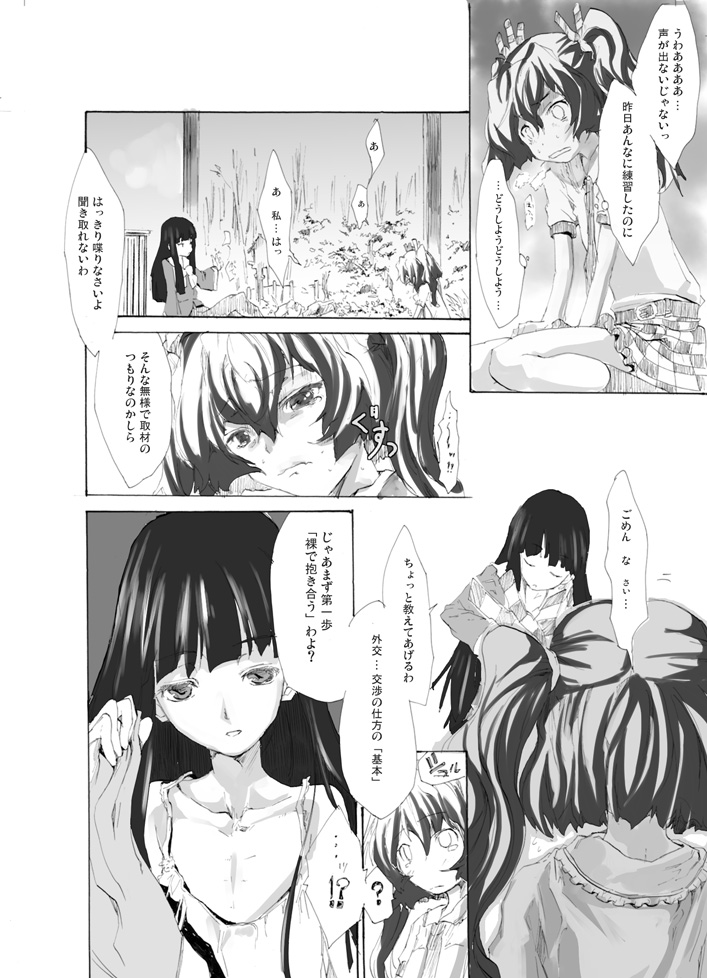 そんなわけでさとりの金閣寺に対するオリジナルの意見を取材に行ったはたてがうまくしゃべれず、見かねた姫様がその外交スキルを伝授する第一段階として、心を開かせるため裸で抱き合って(ryみたいなシーンをお願いします。